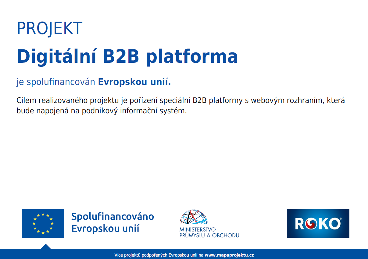 Projekt, který podpořilo Ministerstvo průmyslu a obchodu ČR v rámci operačního programu Technologie a aplikace pro konkurenceschopnost, přináší přesně to, co jsme slíbili: speciální ROKO B2B platformu (www.roko.cz) s intuitivním webovým rozhraním, napojenou přímo na náš podnikový informační systém. Co to znamená v praxi? Konec zdlouhavých telefonátů, zapomenutých e-mailů a nejasností. Místo toho okamžitý přístup ke všemu podstatnému – dostupnost zboží, aktuální stav objednávek, faktury, individuální ceny zákazníků, informace o dopravě. Všechno na jednom místě.